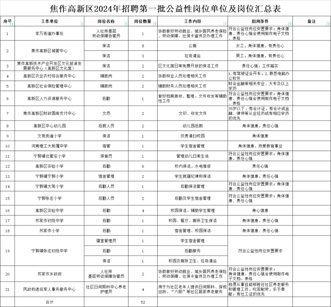 焦作高新区2024年第一批公益性岗位招聘公告